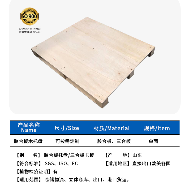 免熏蒸木托盤是采用膠合板制作(膠合板屬于人造板類材料又叫三合板、復(fù)合板等),均選用厚度10~18mm的板材做為托盤原料,堅固耐用,除可生產(chǎn)符合各國標(biāo)準(zhǔn)的產(chǎn)品外,也可根據(jù)用戶需求訂做各種尺寸托盤。