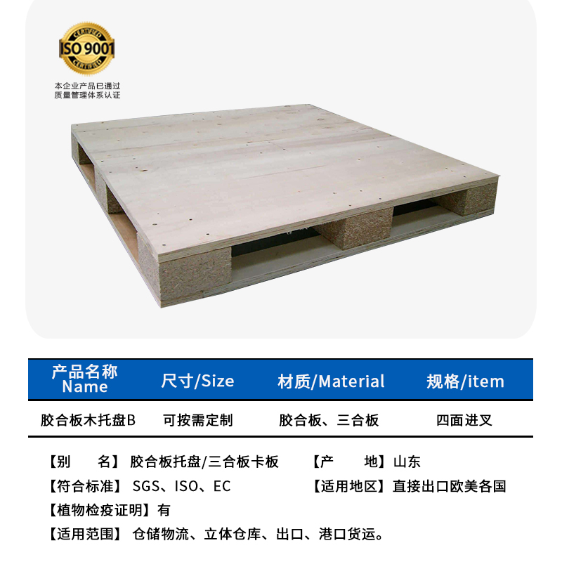 免熏蒸木托盤(pán)是采用膠合板制作(膠合板屬于人造板類(lèi)材料又叫三合板、復(fù)合板等),均選用厚度10~18mm的板材做為托盤(pán)原料,堅(jiān)固耐用,除可生產(chǎn)符合各國(guó)標(biāo)準(zhǔn)的產(chǎn)品外,也可根據(jù)用戶需求訂做各種尺寸托盤(pán)。